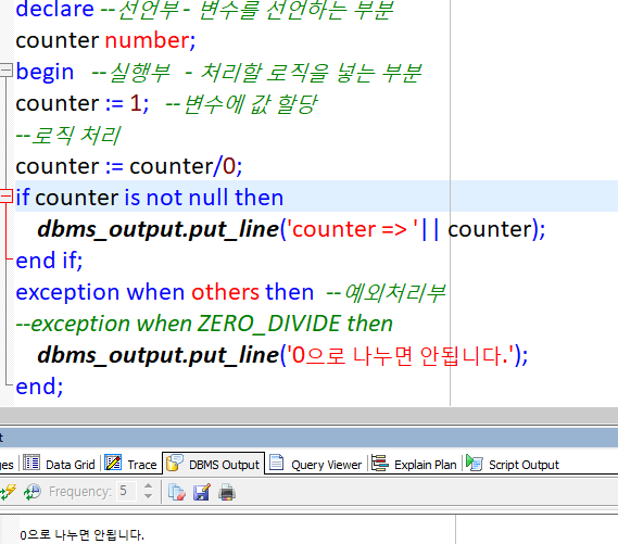 dbms_output.put_line('0으로 나누면 안됩니다.');