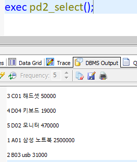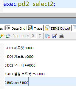 execute pd2_insert('D01','컴퓨터',1500000,'HP');