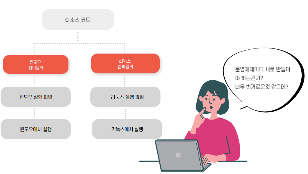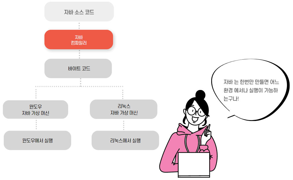 운영체제에서 직접 실행하는게 아니라 가상 머신에서 먼저 실행하고, 이 가상 머신이 운영체제에 맞는 완벽한 실행파일로 바꾸어준다.