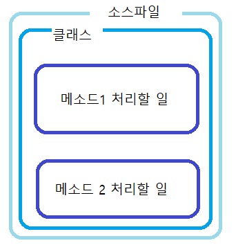 - 자바 소스코드는 클래스 안에 메소드가 속해있으며, 적어도 하나의 클래스와 메소드가 존재 해야하며 소스코드를 실행 한다는 것은 메인 메서드가 속한 클래스를 찾아서 순차적으로 실행한다는 의미이다.