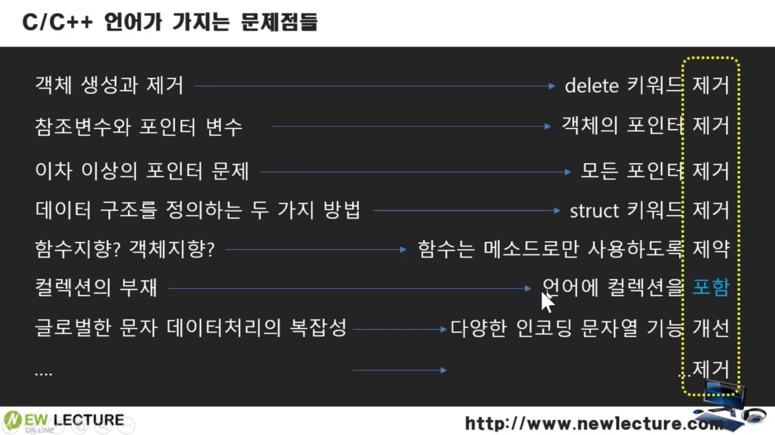 ⇒ C++ 과 비교했을때의 자바언어의 특징은
