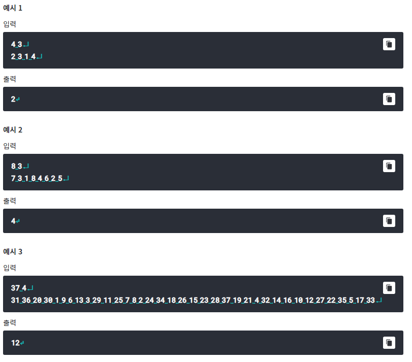 즉, 예시를 보며 설명해주자면 첫번째 예시에서 입력 형식이 4(N) 3(K) 2 3 1 4 이 순서대로가 된다.