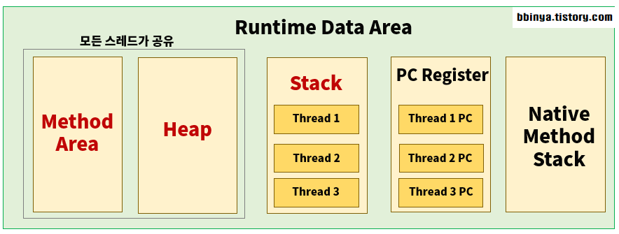 총 5가지의 영역인 Method Area (=Class Area), Heap Area, Stack Area, PC Register, Native Method Stack Area