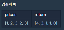 초 단위로 기록된 주식가격이 담긴 배열 prices가 매개변수로 주어질 때, 가격이 떨어지지 않은 기간은 몇 초인지를 return 하도록 solution 함수를 완성하세요.