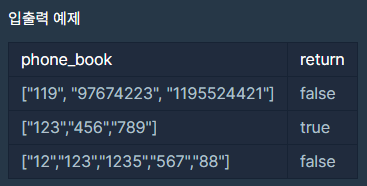 전화번호부에 적힌 전화번호를 담은 배열 phone_book 이 solution 함수의 매개변수로 주어질 때, 어떤 번호가 다른 번호의 접두어인 경우가 있으면 false를 그렇지 않으면 true를 return 하도록 solution 함수를 작성해주세요.