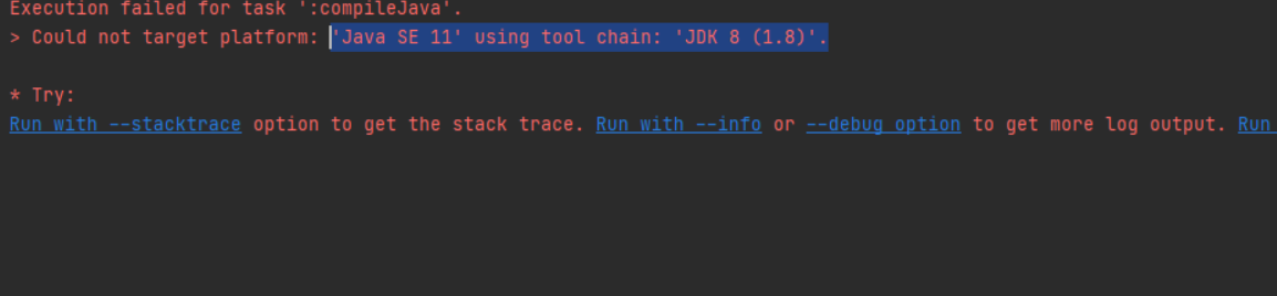JDK 11버전을 다운 받은 후, Gradle JVM버전을 11로 바꾸면 해결!
