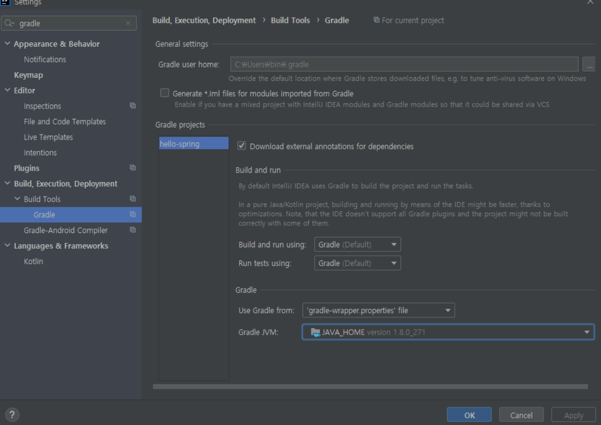File-setting 검색창에 gradle 이라 검색하였더니, JDK 11버전이 아닌것을 확인하자.