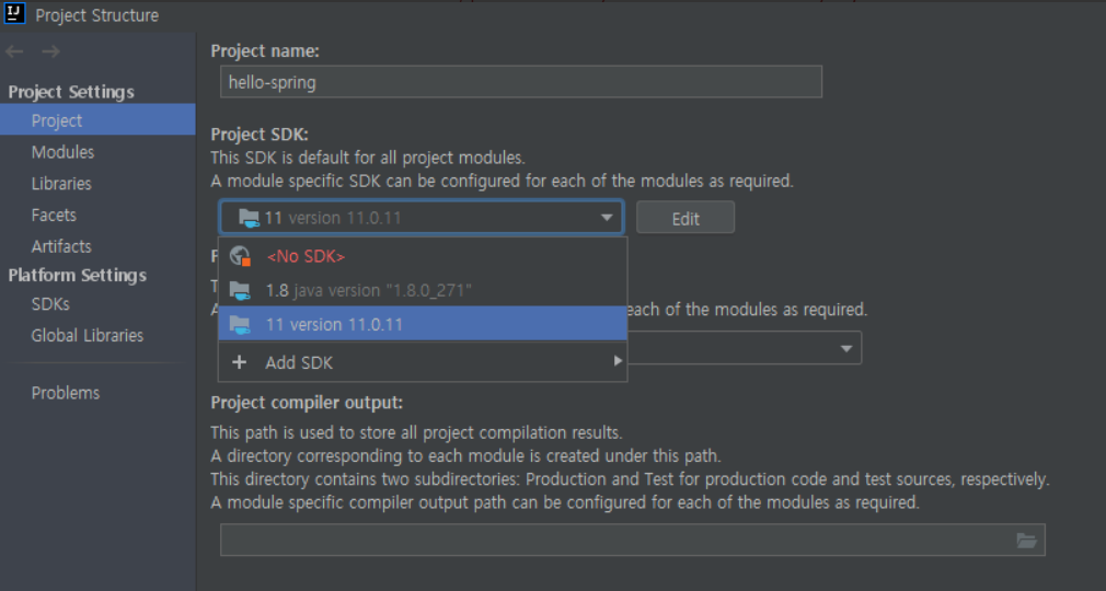 File - Project Structure 들어가서 11버전으로 바꾸어준다.