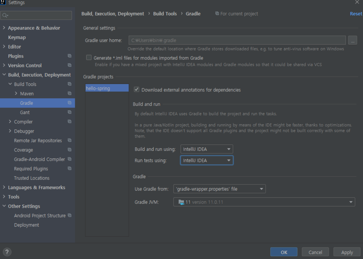 File - Settings 메뉴 클릭 gradle 검색 → Build and run using, Run tests using 둘 다 IntelliJ IDEA 로 변경한다.